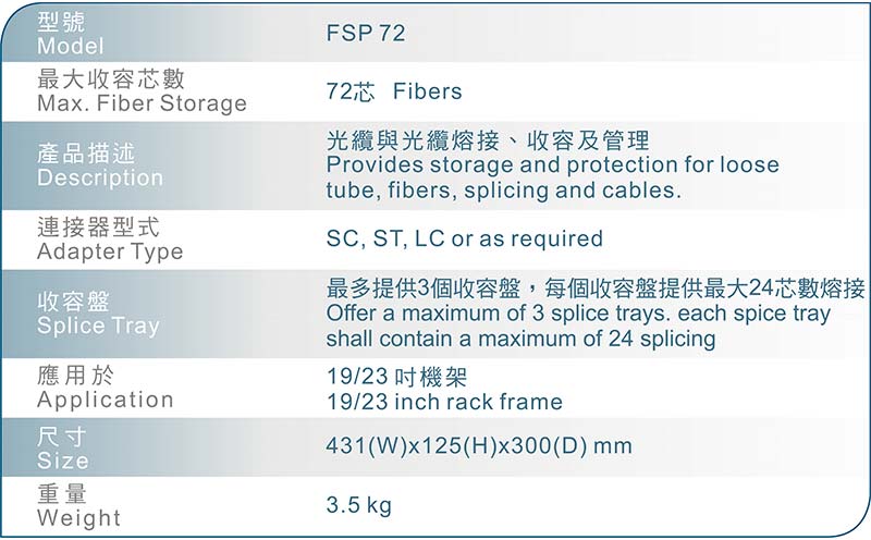 Rack-Mount Fiber Splicing Panel (FSP72) HOME PRODUCT PON Products Rack-Mount Patch Panel Rack-Mount Fiber Splicing Panel (FSP72) FSP 72 Description Specifications