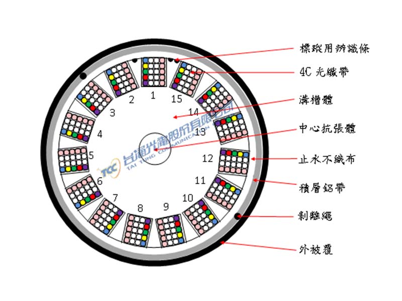- 溝槽型光纜將光纖帶層層置入溝槽體之溝槽內,溝槽體中有中心抗張體以增加強度,並有止水不織布包住溝槽體周圍做為防水用。
